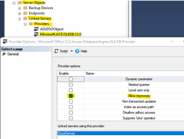 b. Verify the settings were set. Expand “Server Objects”, “Linked Servers”, “Providers”. Right click on the Microsoft.ACE.OLEDB.12.0 provider and click Properties.