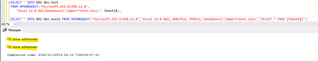 SELECT * INTO DB_name.dbo.test2 FROM OPENROWSET('Microsoft.ACE.OLEDB.12.0','Excel 12.0 Xml; HDR=YES; IMEX=1; Database=C:\import\test.xlsx','SELECT * FROM [Sheet1$]')